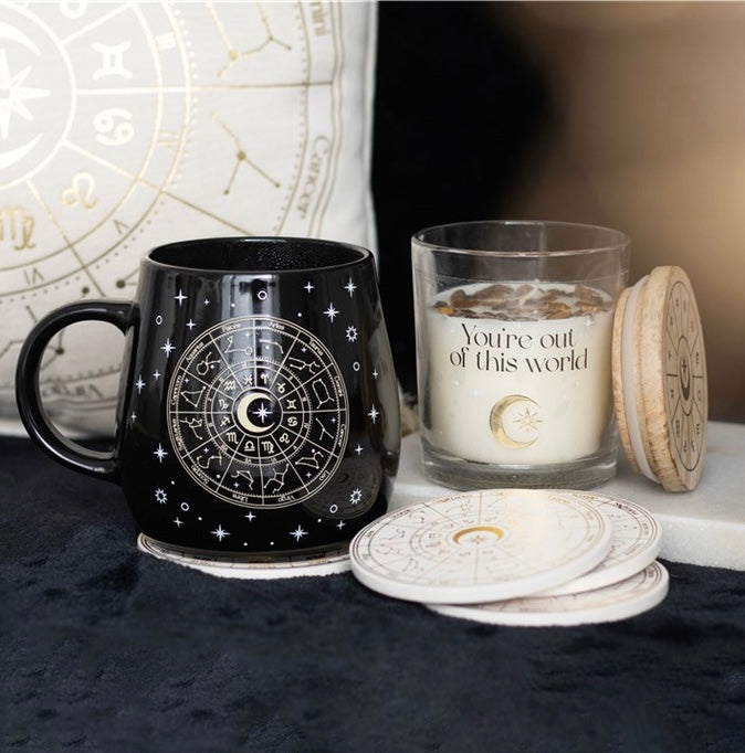 Add a touch of celestial magic to your morning cuppa with this extraordinary heat changing mug. Watch as the heat gradually illuminates a gold Astrology Wheel design surrounded by twinkling stars on this black ceramic mug. 500ml capacity, dishwasher safe, not safe for microwave.