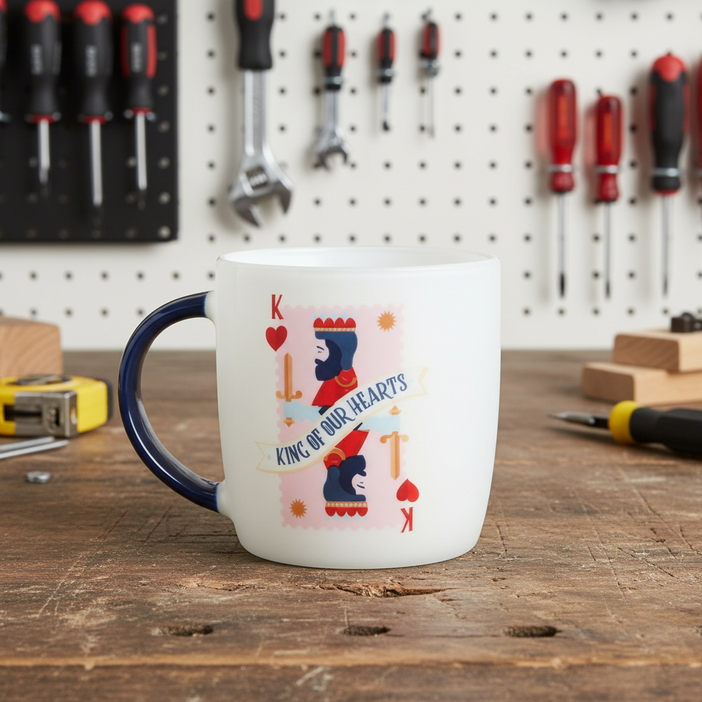 Celebrate the one who holds your heart with this charming gift set, featuring a white mug with a navy blue handle and a king playing card design. The mug is complemented by a matching deck of playing cards, both finished with the 'King of our hearts' text. Perfect for a thoughtful Father's Day gift or personal treat. 350ml capacity. Do not microwave. Hand wash only.