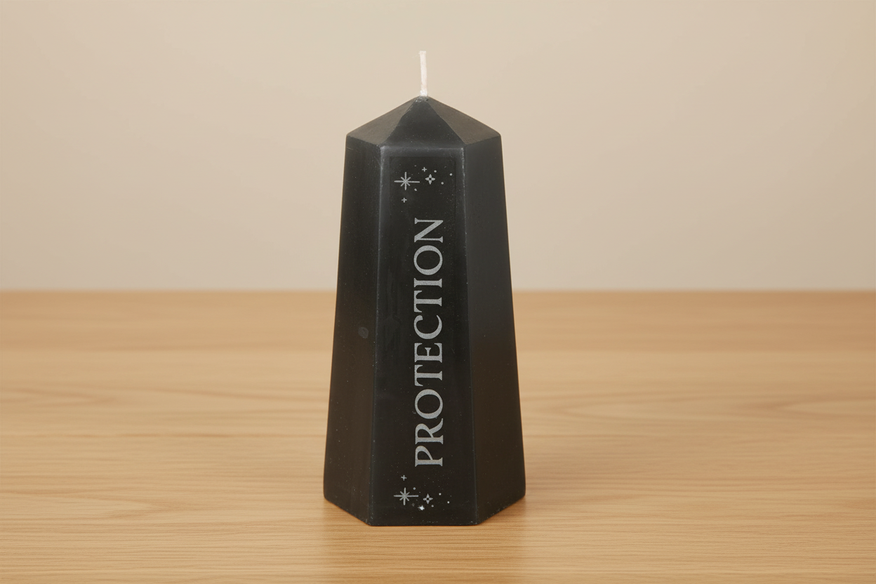 Repell unwanted energies and promote inner clarity with this Protection Crystal Candle. Shaped like a black crystal tower, this candle offers up to 30 hours of burn time to gradually reveal a rough obsidian stone hidden at the bottom. Perfect for setting intentions and manifesting your dreams, it's the ideal accessory to complement your sacred space. Unscented paraffin wax. Burn on a protected surface.